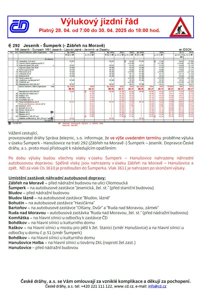 Ve dnech od 28. dubna 2025, 6:30 hod. do 30. dubna 2025, 18:00 hod. dojde k nepřetržité výluce na trati mezi Šumperkem a Hanušovicemi. Dopravce České dráhy doporučuje cestujícím se informovat o jízdních řádech a opatřeních na svých stránkách.
