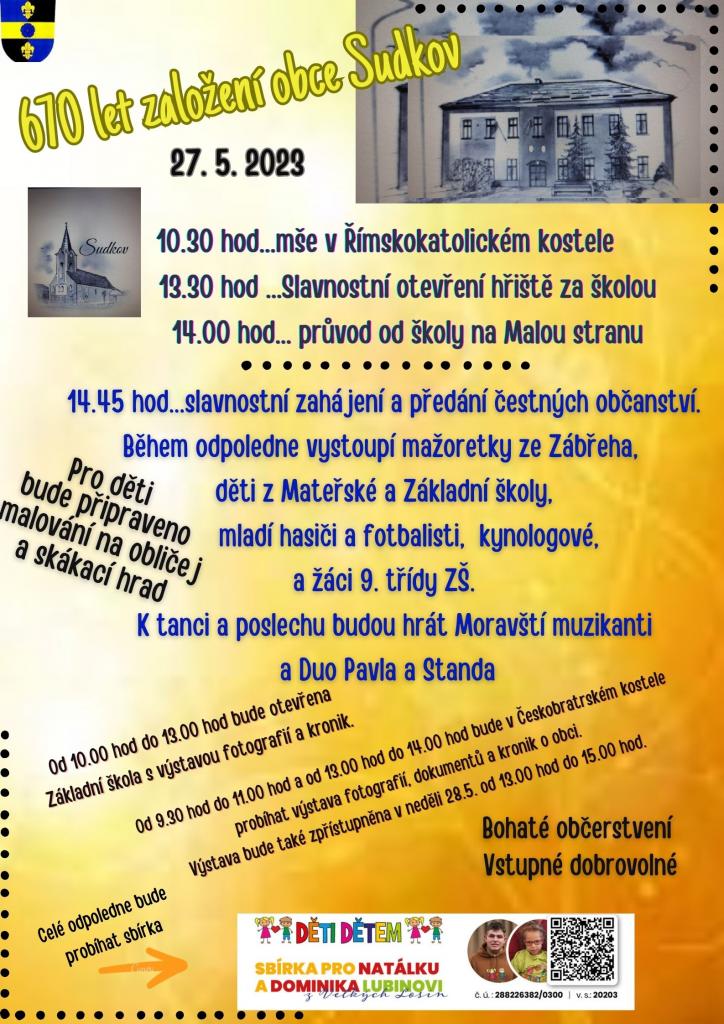 Pozvánka na oslavy 670 let od založení obce Sudkov v termínu od 26.5.2023 do 28.5.2023.