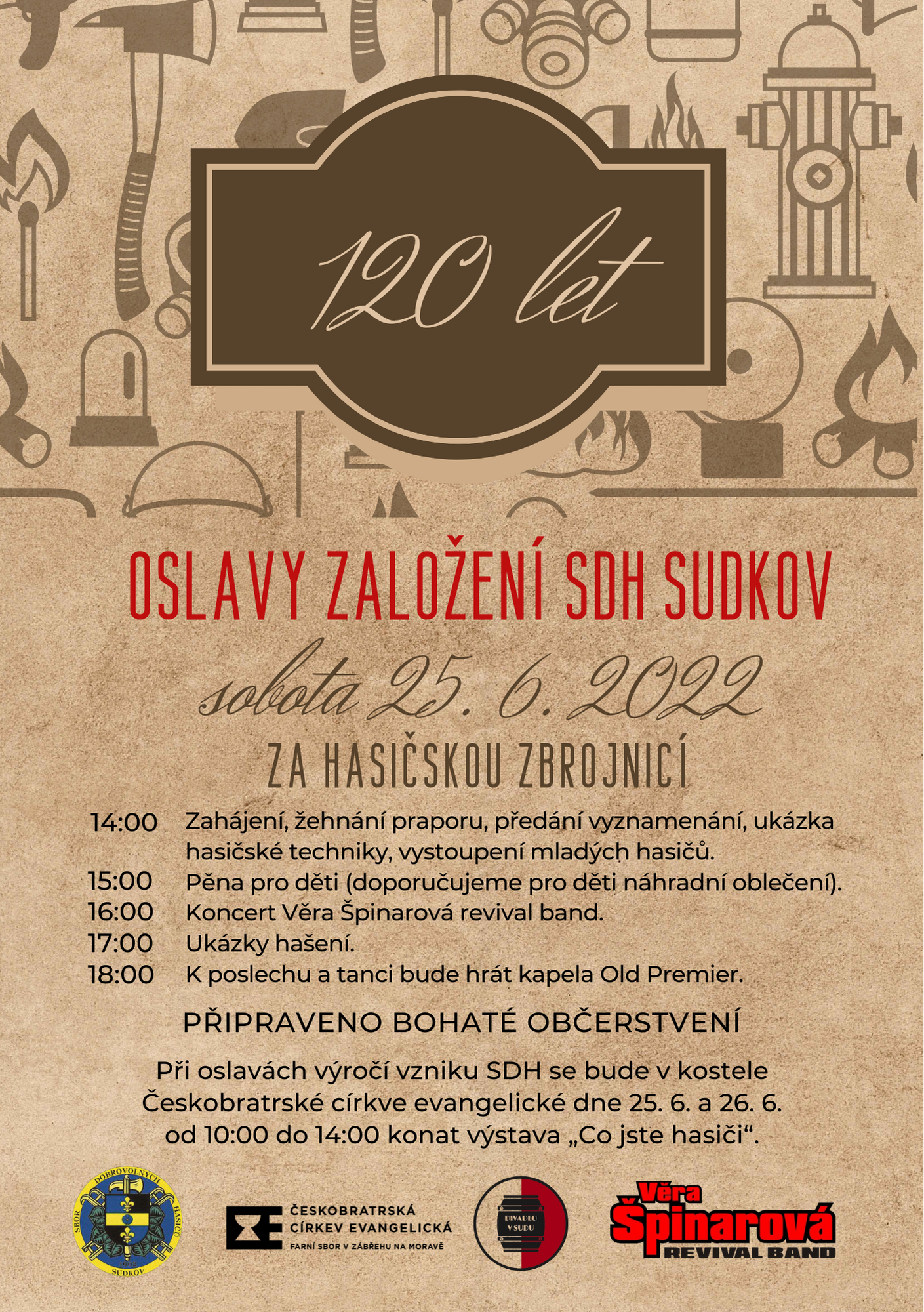 Oslavy založení SDH Sudkov - 120 let se uskuteční v sobotu 25.6.2022 za hasičskou zbrojnicí v Sudkově od 14:00 hod.