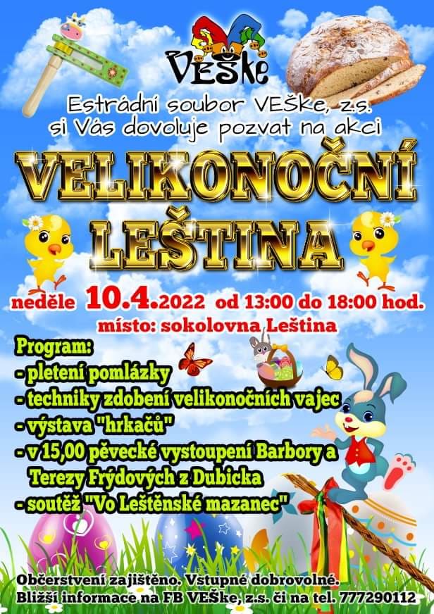 V neděli dne 10.4. bude Estrádní soubor VEŠke, z.s. pořádat v sokolovně Leština od 13:00-18:00 hod. akci "VELIKONOČNÍ LEŠTINA"- pletení pomlázky, různé techniky barvení vajíček, soutěž "Vo Leštěnské mazanec". Od 15:00 hod. se uskuteční pěvecký koncert sester Barbory a Terezy Frýdových z Dubicka.