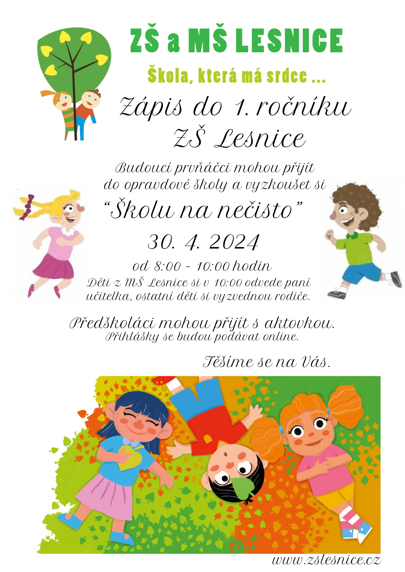 ZŠ a MŠ Lesnice - Zápis do 1. ročníku ZŠ Lesnice dne 30. 4. 2024 od 8:00 - 10:00 hod.