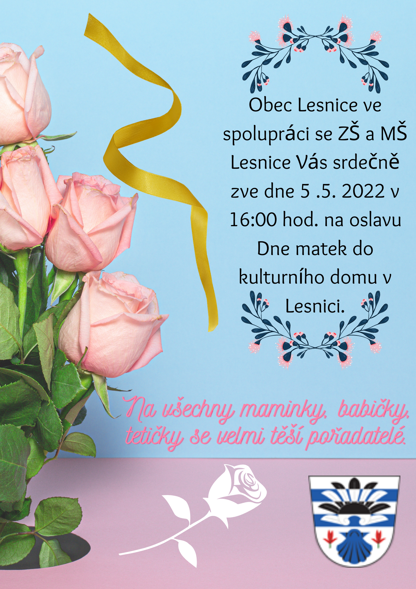 Obec Lesnice ve spolupráci se ZŠ a MŠ Lesnice pořádá ve čtvrtek 5. 5. 2022 v 16:00 hod. v kulturním domě v Lesnici oslavu "Dne matek".