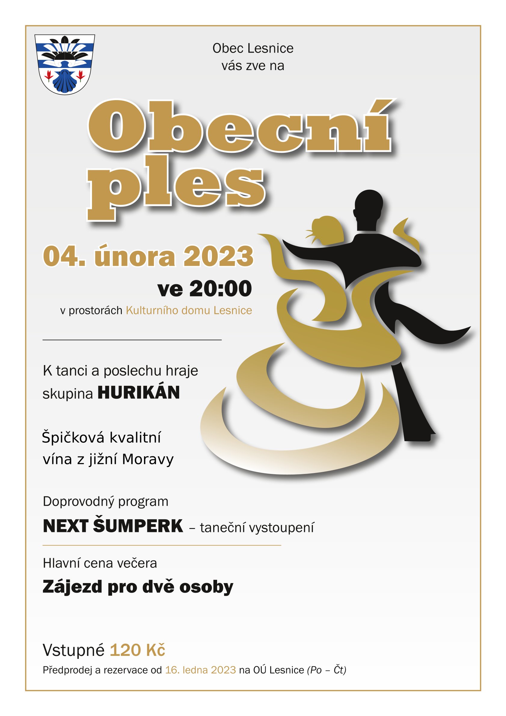 Obec Lesnice Vás zve na Obecní ples v sobotu dne 4. února 2023, který se koná v kulturním domě v Lesnici ve 20:00 hod.